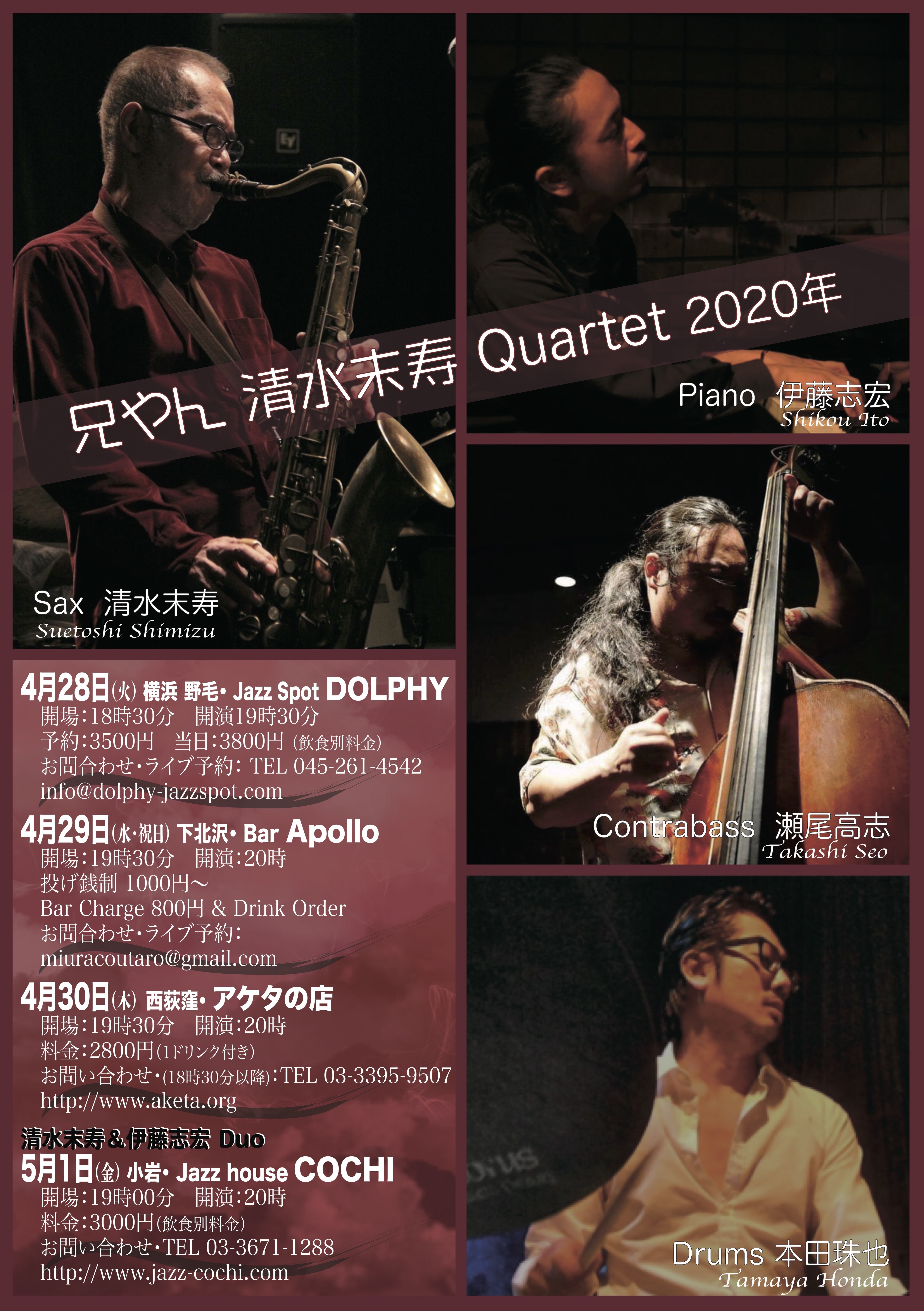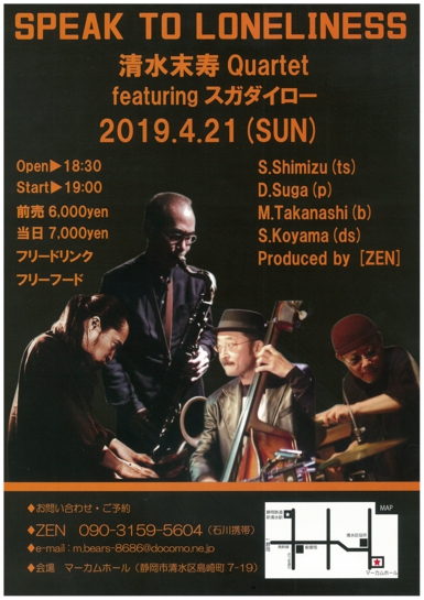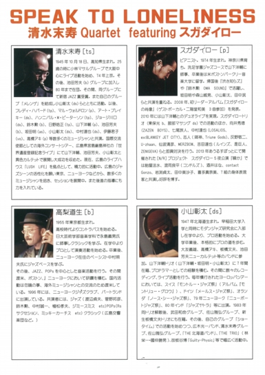 清水末寿 (t,sax) 伊藤志宏 (piano) 瀬尾高志 (w,bass) 本田珠也 (drums)