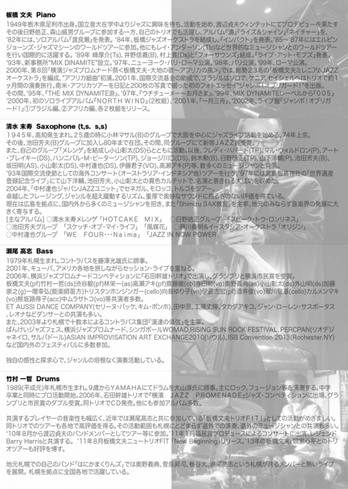 清水未寿(Sax)、河野直博(Per)、田口英穂(Bass)、筒井唱仁(Dr)