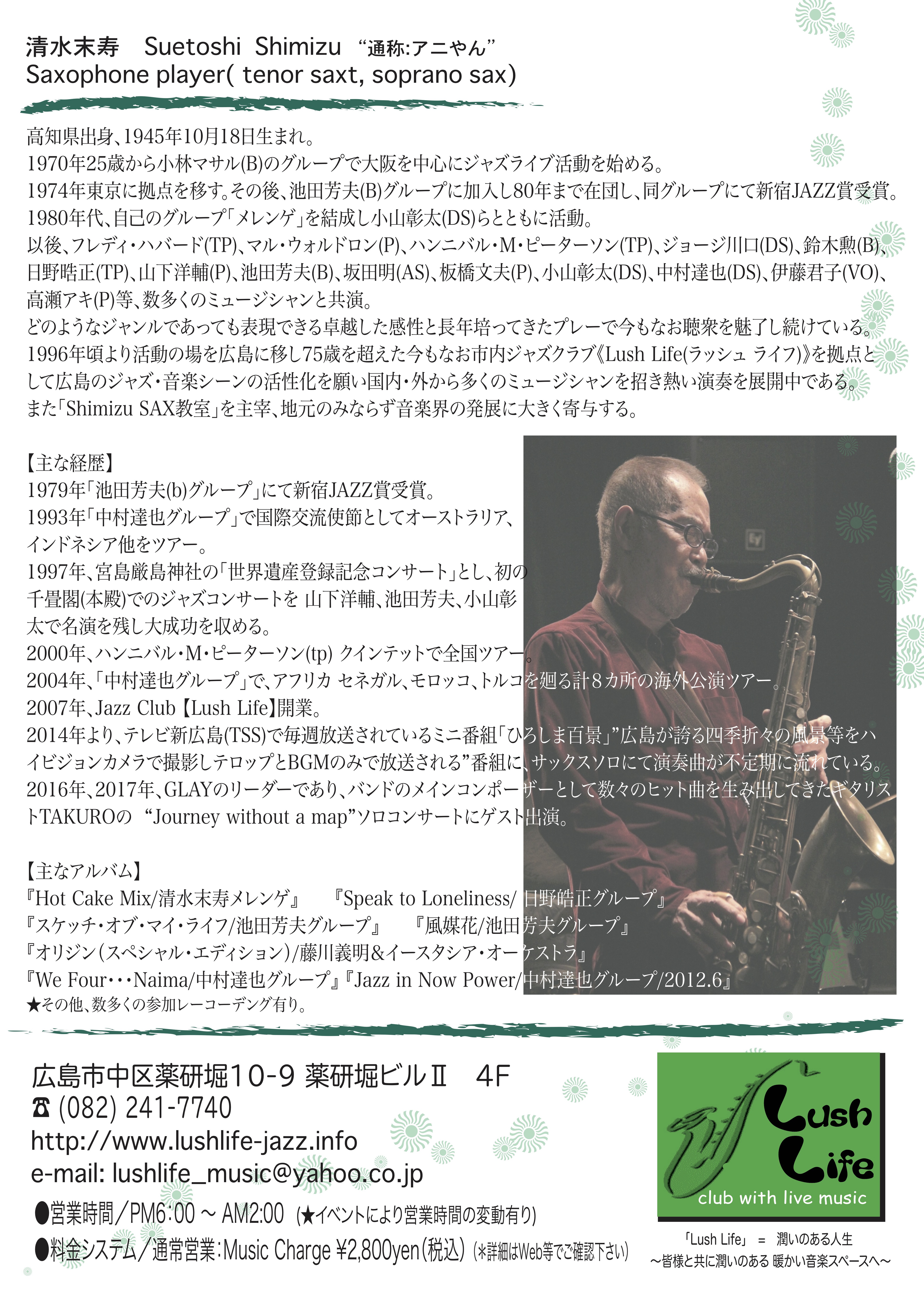 sax奏者 清水末寿さんの紹介ページです。 注:他会場での公演(ツアー予定等ご紹介)